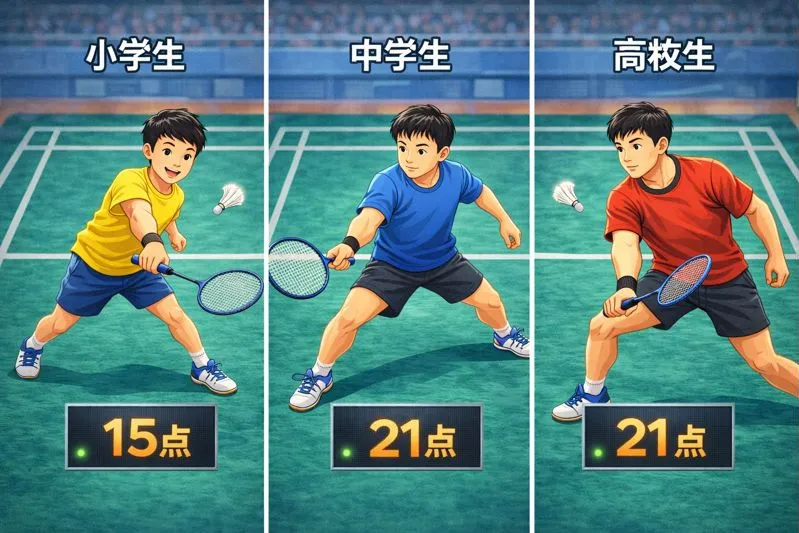 小中高のバドミントン点数制度の違いを並列表示した図解イラスト
