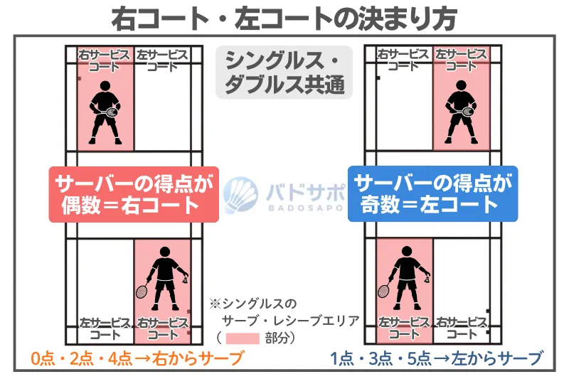 バドミントンでは、サーバーの得点によって立つ場所が決まります。
