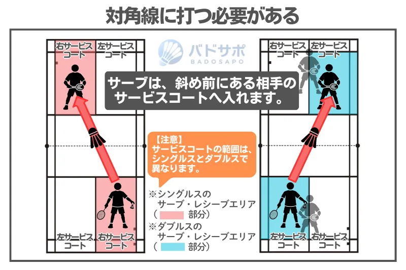 サーブは、斜め前にある相手のサービスコートへ入れます