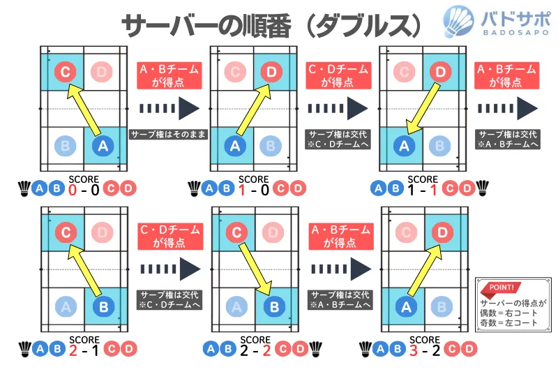 バドミントン サーブ順番とサーブ権の交代|ダブルスの得点後の流れ